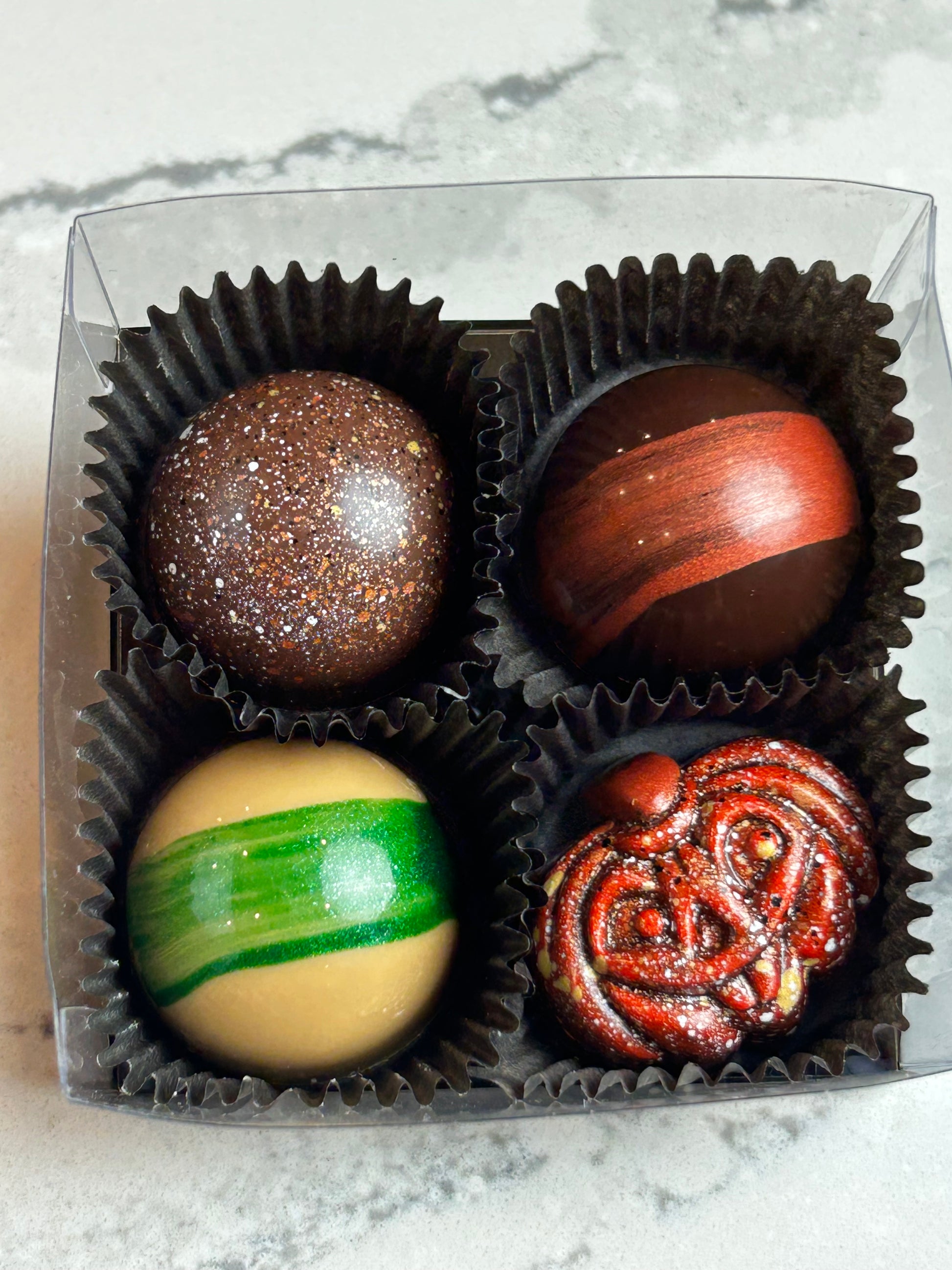 Enjoy a delicious taste of autumn with our Fall Bonbon Collection! This set includes one of each seasonal favorite: Milk Chocolate S’more, Dark Chocolate Maple Caramel, Golden Apple, and the ever-popular Pumpkin Spice. Perfect for cozy moments or sharing the flavors of fall!